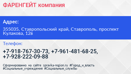 ФАРЕНГЕЙТ, компания по адресу 355035, Ставропольский край, Ставрополь, проспект Кулакова, 12в в дальнейшем Организация, размещена в следующих категориях: