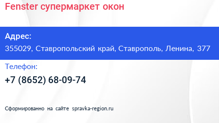 Fenster, супермаркет окон по адресу 355029, Ставропольский край, Ставрополь, Ленина, 377 в дальнейшем Организация, размещена в следующих категориях: