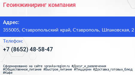 Геоинжиниринг, компания по адресу 355005, Ставропольский край, Ставрополь, Шпаковская, 2 в дальнейшем Организация, размещена в следующих категориях: