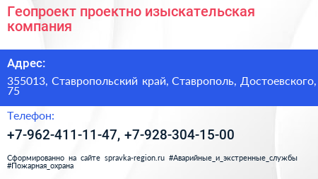 Геопроект, проектно-изыскательская компания по адресу 355013, Ставропольский край, Ставрополь, Достоевского, 75 в дальнейшем Организация, размещена в следующих категориях: