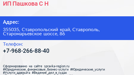 ИП Пашкова С.Н. по адресу 355035, Ставропольский край, Ставрополь, Старомарьевское шоссе, 86 в дальнейшем Организация, размещена в следующих категориях:
