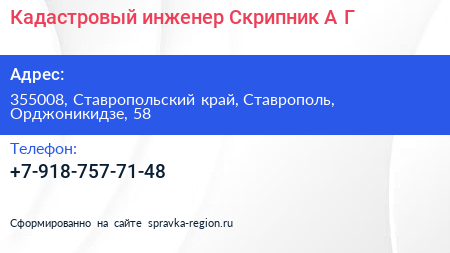 Кадастровый инженер Скрипник А.Г. по адресу 355008, Ставропольский край, Ставрополь, Орджоникидзе, 58 в дальнейшем Организация, размещена в следующих категориях: