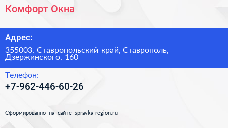 Комфорт Окна по адресу 355003, Ставропольский край, Ставрополь, Дзержинского, 160 в дальнейшем Организация, размещена в следующих категориях: