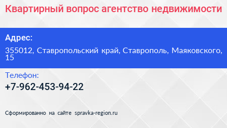 Квартирный вопрос, агентство недвижимости по адресу 355012, Ставропольский край, Ставрополь, Маяковского, 15 в дальнейшем Организация, размещена в следующих категориях: