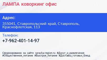 ЛАМПА, коворкинг-офис по адресу 355041, Ставропольский край, Ставрополь, Краснофлотская, 113 в дальнейшем Организация, размещена в следующих категориях: