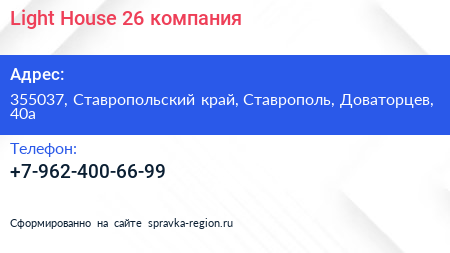Light House 26, компания по адресу 355037, Ставропольский край, Ставрополь, Доваторцев, 40а в дальнейшем Организация, размещена в следующих категориях: