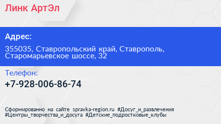 Линк-АртЭл по адресу 355035, Ставропольский край, Ставрополь, Старомарьевское шоссе, 32 в дальнейшем Организация, размещена в следующих категориях: