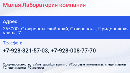 Малая Лаборатория, компания по адресу 355000, Ставропольский край, Ставрополь, Придорожная улица, 7 в дальнейшем Организация, размещена в следующих категориях: