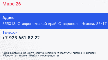 Марс 26 по адресу 355013, Ставропольский край, Ставрополь, Чехова, 85/17 в дальнейшем Организация, размещена в следующих категориях: