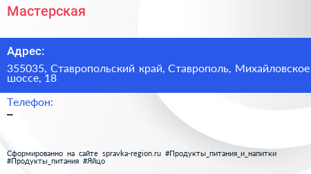 Мастерская по адресу 355035, Ставропольский край, Ставрополь, Михайловское шоссе, 18 в дальнейшем Организация, размещена в следующих категориях:
