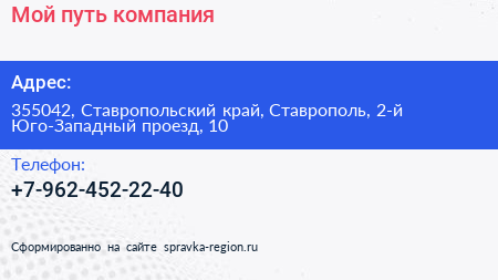 Мой путь, компания по адресу 355042, Ставропольский край, Ставрополь, 2-й Юго-Западный проезд, 10 в дальнейшем Организация, размещена в следующих категориях: