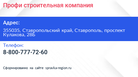 Профи, строительная компания по адресу 355035, Ставропольский край, Ставрополь, проспект Кулакова, 28Б в дальнейшем Организация, размещена в следующих категориях: