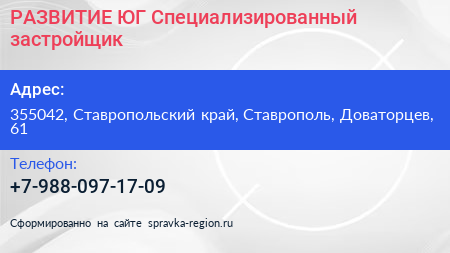 РАЗВИТИЕ-ЮГ, Специализированный застройщик по адресу 355042, Ставропольский край, Ставрополь, Доваторцев, 61 в дальнейшем Организация, размещена в следующих категориях: