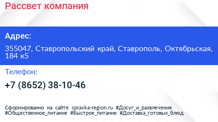 Рассвет, компания по адресу 355047, Ставропольский край, Ставрополь, Октябрьская, 184 к5 в дальнейшем Организация, размещена в следующих категориях: