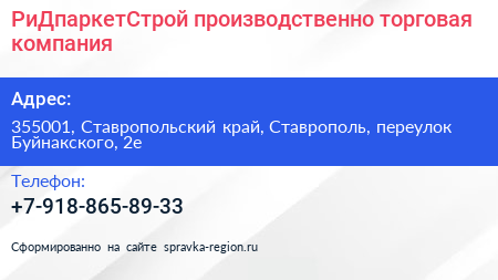 РиДпаркетСтрой, производственно-торговая компания по адресу 355001, Ставропольский край, Ставрополь, переулок Буйнакского, 2е в дальнейшем Организация, размещена в следующих категориях: