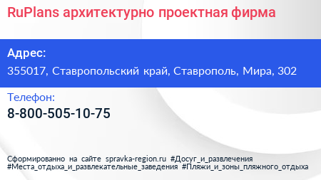 RuPlans, архитектурно-проектная фирма по адресу 355017, Ставропольский край, Ставрополь, Мира, 302 в дальнейшем Организация, размещена в следующих категориях: