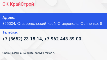 СК КрайСтрой по адресу 355004, Ставропольский край, Ставрополь, Осипенко, 8 в дальнейшем Организация, размещена в следующих категориях: