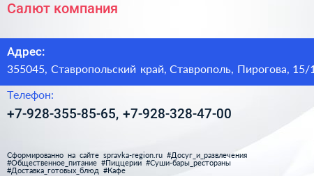 Салют, компания по адресу 355045, Ставропольский край, Ставрополь, Пирогова, 15/1 в дальнейшем Организация, размещена в следующих категориях: