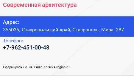 Современная архитектура по адресу 355035, Ставропольский край, Ставрополь, Мира, 297 в дальнейшем Организация, размещена в следующих категориях:
