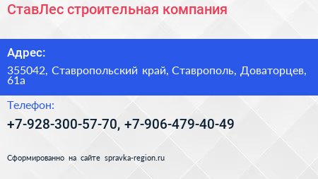 СтавЛес, строительная компания по адресу 355042, Ставропольский край, Ставрополь, Доваторцев, 61а в дальнейшем Организация, размещена в следующих категориях: