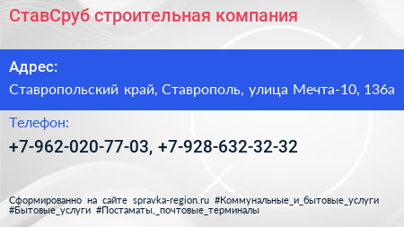 СтавСруб, строительная компания по адресу Ставропольский край, Ставрополь, улица Мечта-10, 136а в дальнейшем Организация, размещена в следующих категориях: