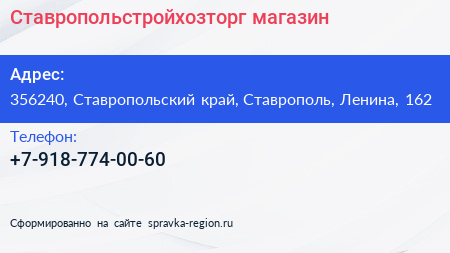 Ставропольстройхозторг, магазин по адресу 356240, Ставропольский край, Ставрополь, Ленина, 162 в дальнейшем Организация, размещена в следующих категориях: