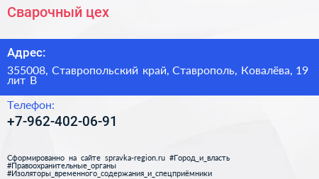 Сварочный цех по адресу 355008, Ставропольский край, Ставрополь, Ковалёва, 19 лит В в дальнейшем Организация, размещена в следующих категориях: