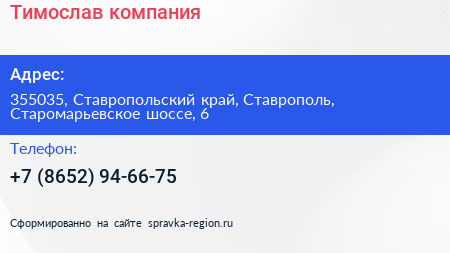 Тимослав, компания по адресу 355035, Ставропольский край, Ставрополь, Старомарьевское шоссе, 6 в дальнейшем Организация, размещена в следующих категориях: