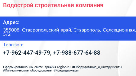 Водострой, строительная компания по адресу 355008, Ставропольский край, Ставрополь, Селекционная, 5/2 в дальнейшем Организация, размещена в следующих категориях: