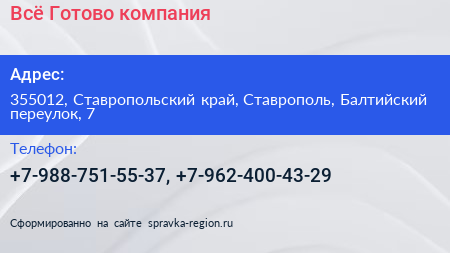 Всё Готово, компания по адресу 355012, Ставропольский край, Ставрополь, Балтийский переулок, 7 в дальнейшем Организация, размещена в следующих категориях: