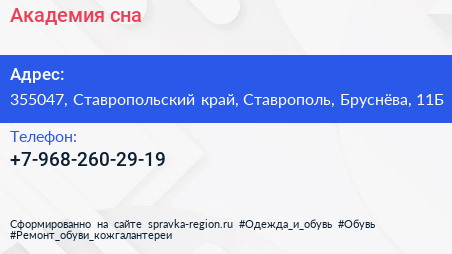 Академия сна по адресу 355047, Ставропольский край, Ставрополь, Бруснёва, 11Б в дальнейшем Организация, размещена в следующих категориях: