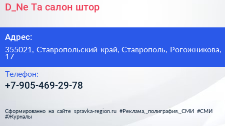 D_Ne & Ta, салон штор по адресу 355021, Ставропольский край, Ставрополь, Рогожникова, 17 в дальнейшем Организация, размещена в следующих категориях: