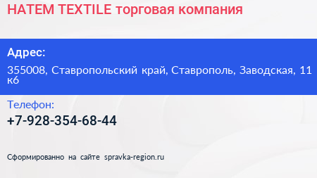 HATEM TEXTILE, торговая компания по адресу 355008, Ставропольский край, Ставрополь, Заводская, 11 к6 в дальнейшем Организация, размещена в следующих категориях: