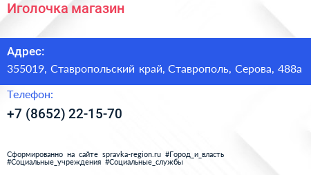 Иголочка, магазин по адресу 355019, Ставропольский край, Ставрополь, Серова, 488а в дальнейшем Организация, размещена в следующих категориях: