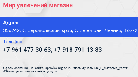 Мир увлечений, магазин по адресу 356242, Ставропольский край, Ставрополь, Ленина, 167/2 в дальнейшем Организация, размещена в следующих категориях: