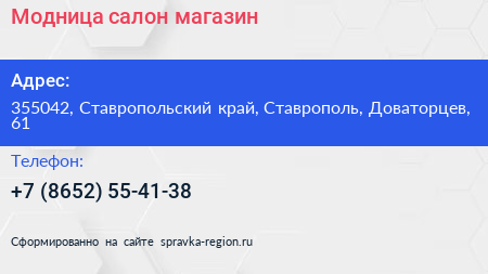 Модница, салон-магазин по адресу 355042, Ставропольский край, Ставрополь, Доваторцев, 61 в дальнейшем Организация, размещена в следующих категориях: