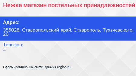 Нежка, магазин постельных принадлежностей по адресу 355028, Ставропольский край, Ставрополь, Тухачевского, 26 в дальнейшем Организация, размещена в следующих категориях: