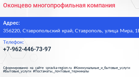 Оконцево, многопрофильная компания по адресу 356220, Ставропольский край, Ставрополь, улица Мира, 1Б в дальнейшем Организация, размещена в следующих категориях:
