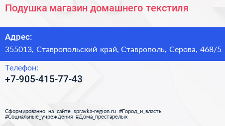 Подушка, магазин домашнего текстиля по адресу 355013, Ставропольский край, Ставрополь, Серова, 468/5 в дальнейшем Организация, размещена в следующих категориях: