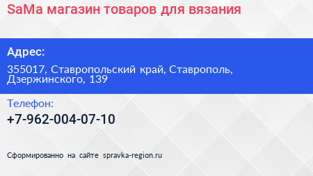 SaMa, магазин товаров для вязания по адресу 355017, Ставропольский край, Ставрополь, Дзержинского, 139 в дальнейшем Организация, размещена в следующих категориях:
