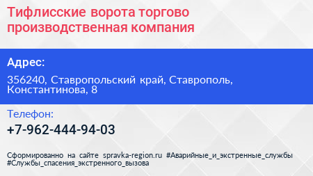 Тифлисские ворота, торгово-производственная компания по адресу 356240, Ставропольский край, Ставрополь, Константинова, 8 в дальнейшем Организация, размещена в следующих категориях: