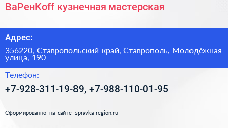 ВаРенKoff, кузнечная мастерская по адресу 356220, Ставропольский край, Ставрополь, Молодёжная улица, 190 в дальнейшем Организация, размещена в следующих категориях: