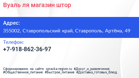 Вуаль-ля, магазин штор по адресу 355002, Ставропольский край, Ставрополь, Артёма, 49 в дальнейшем Организация, размещена в следующих категориях: