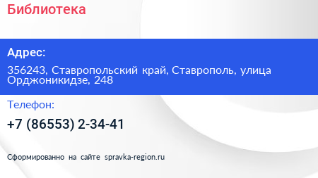 Библиотека по адресу 356243, Ставропольский край, Ставрополь, улица Орджоникидзе, 248 в дальнейшем Организация, размещена в следующих категориях: