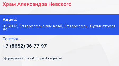 Храм Александра Невского по адресу 355007, Ставропольский край, Ставрополь, Бурмистрова, 94 в дальнейшем Организация, размещена в следующих категориях: