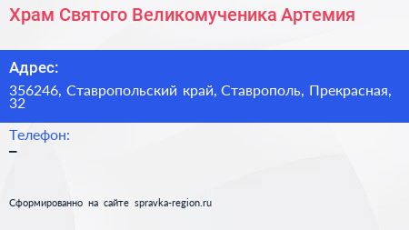 Храм Святого Великомученика Артемия по адресу 356246, Ставропольский край, Ставрополь, Прекрасная, 32 в дальнейшем Организация, размещена в следующих категориях: