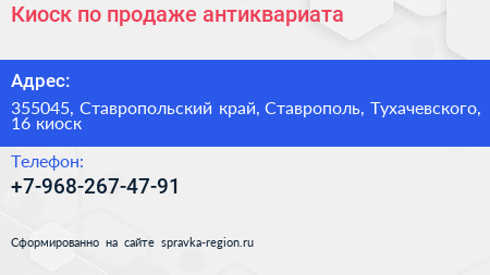 Киоск по продаже антиквариата по адресу 355045, Ставропольский край, Ставрополь, Тухачевского, 16 киоск в дальнейшем Организация, размещена в следующих категориях: