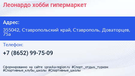 Леонардо, хобби-гипермаркет по адресу 355042, Ставропольский край, Ставрополь, Доваторцев, 75а в дальнейшем Организация, размещена в следующих категориях: