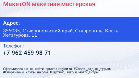 МакетON, макетная мастерская по адресу 355035, Ставропольский край, Ставрополь, Коста Хетагурова, 11 в дальнейшем Организация, размещена в следующих категориях: