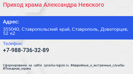 Приход храма Александра Невского по адресу 355040, Ставропольский край, Ставрополь, Доваторцев, 52 к2 в дальнейшем Организация, размещена в следующих категориях: